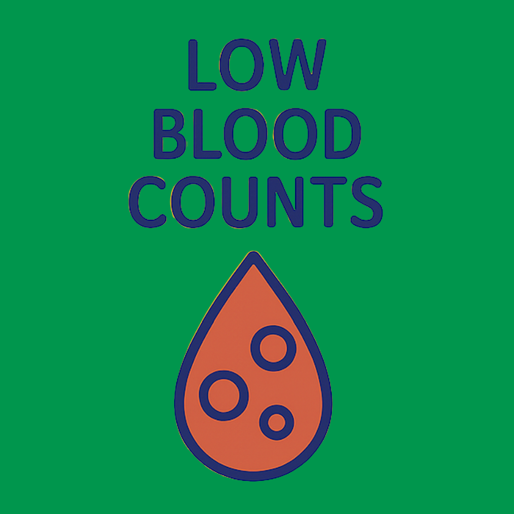 Chemotherapy targets cancer cells but can also damage healthy blood cells. This can lower platelets, which increases the risk of bruising or bleeding, and reduce red blood cells, leading to tiredness and shortness of breath. It can also lower your white blood cell count, making you more likely to get infections. Blood transfusions can replace red cells and platelets but not white cells, so taking care to avoid illness is important.